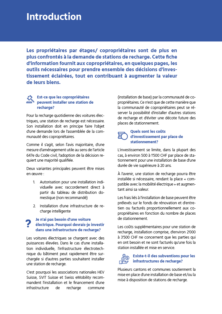 La fiche d’information de l’association professionnelle Swiss eMobility fournit aux propriétaires les informations les plus importantes sur l’infrastructure de recharge dans les propriétés par étage.
