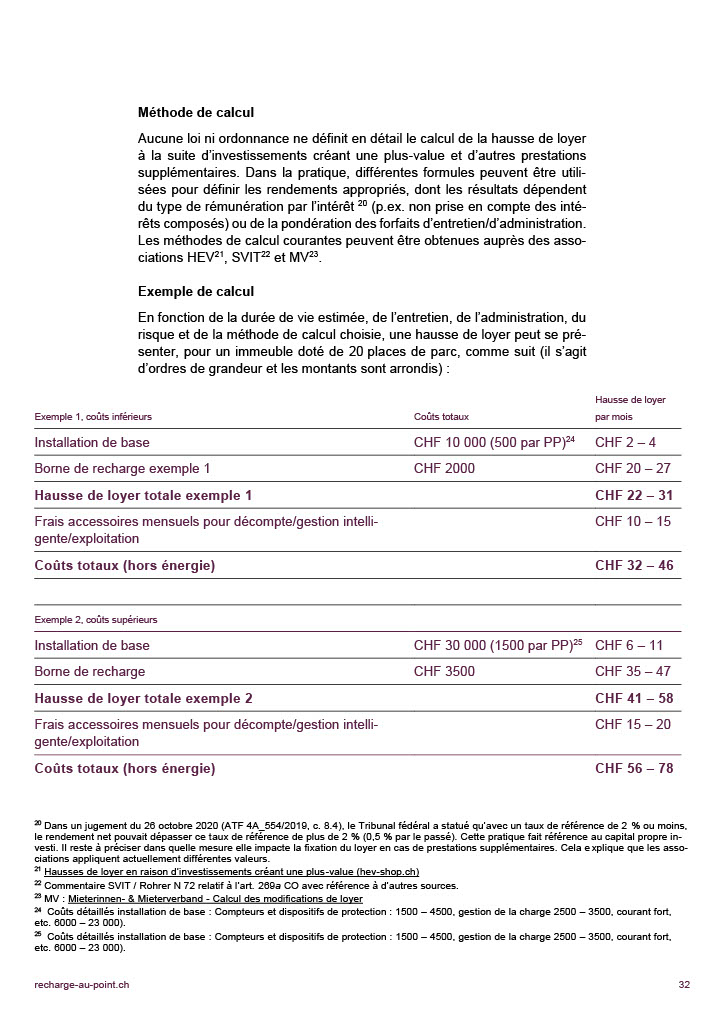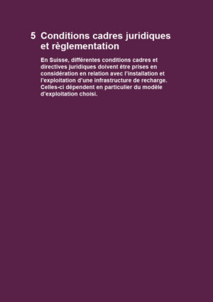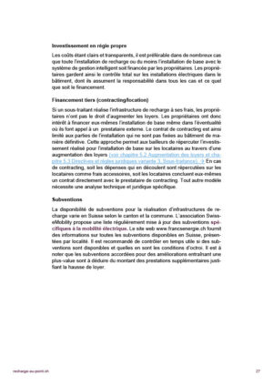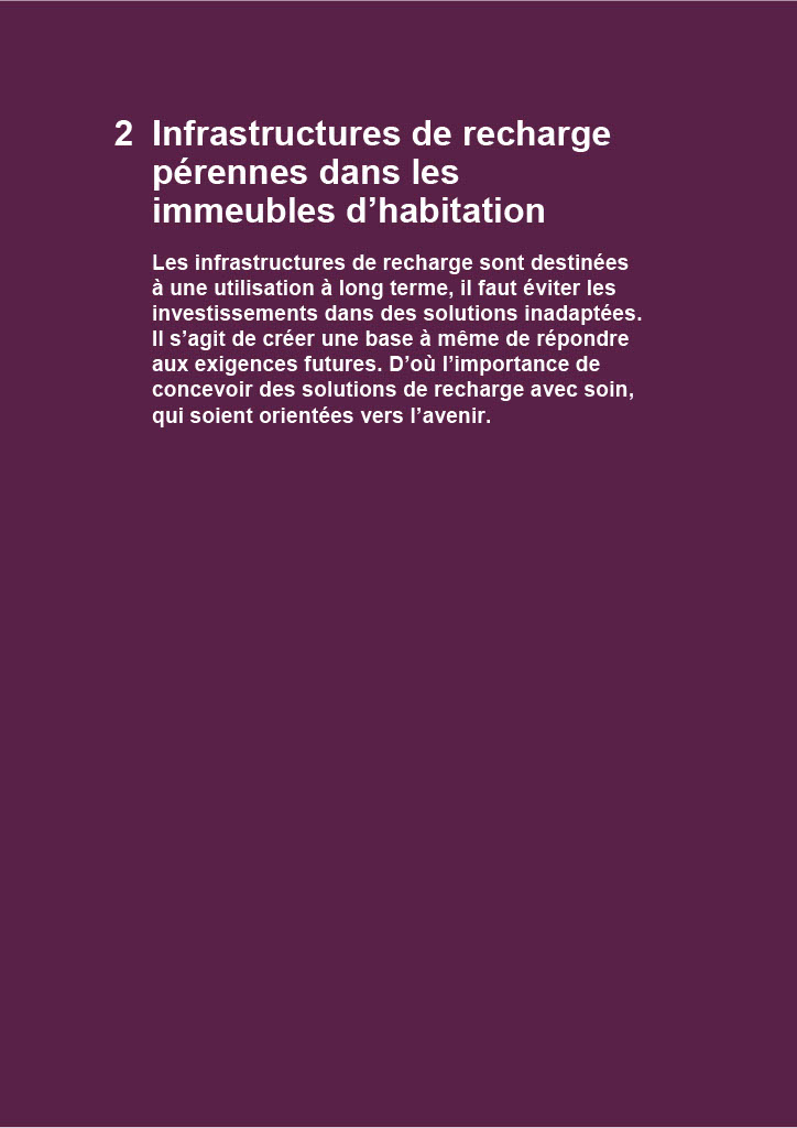 Ce guide montre ce qui caractérise les infrastructures de recharge appropriées et pérennes pour les immeubles locatifs et décrit étape par étape la procédure de mise en place d’une installation de recharge. Une cheklist permet d’établir un concept de mobilité électrique qui résume les principales réflexions et décisions du point de vue du propriétaire ou de la gérance, comme par exemple le nombre de stations de recharge, l’organisation de l’acquisition et de la gestion ou le financement et la facturation aux locataires. Enfin, le guide contient des informations sur les conditions-cadres et les directives juridiques qui doivent être prises en compte en Suisse.