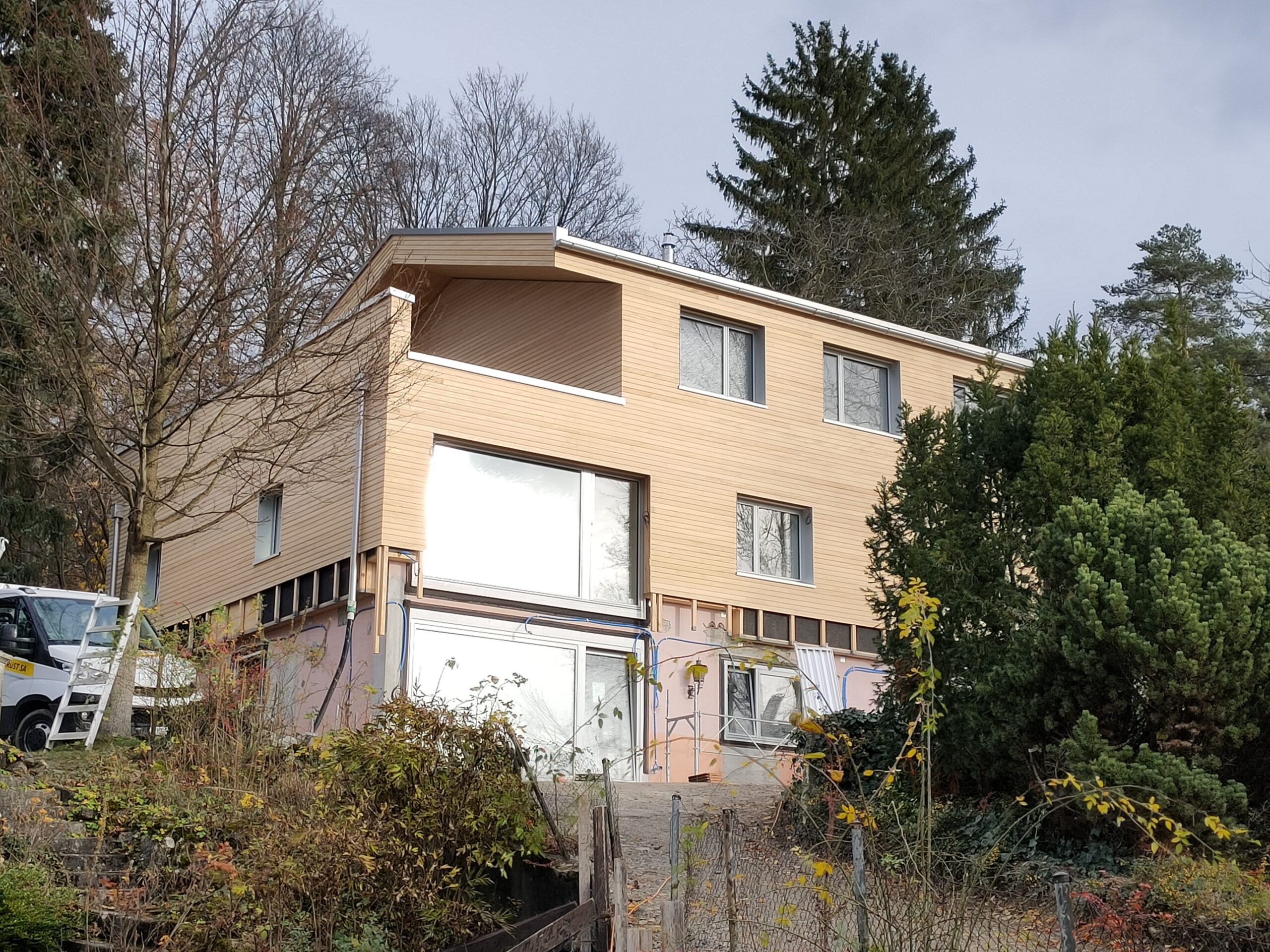 Au centre de Fribourg, une maison familiale avec un grand jardin a connu récemment une métamorphose exemplaire. Trois familles, dont une compte une architecte, l’ont achetée conjointement. En groupe, ils ont planifié la rénovation et la surélévation du bâtiment existant, qui abrite désormais deux appartements. Un nouveau bâtiment est érigé sur la même parcelle. Les travaux sont réalisés selon le standard Minergie-P avec des matériaux biosourcés. Grâce aux revenus locatifs, la banque a accepté de financer le projet.